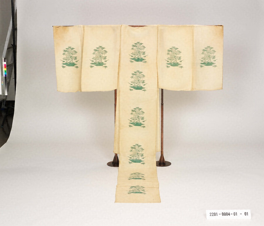 舞楽装束のうち竹鳥文が青摺りされた袍。
