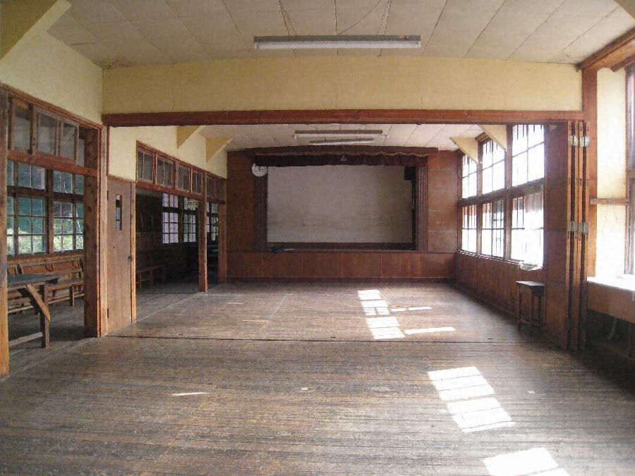 外壁下見板張の校舎。当初から複式学級を想定し、一階に職員室と普通教室、二階に講堂兼特別教室を配す。柱の添柱や小屋の方杖、採光に配慮して広めた窓部や反射光を取り入れる中庇などに当時の学校建築の特徴を示す。山村風景に彩りを添える木造校舎。