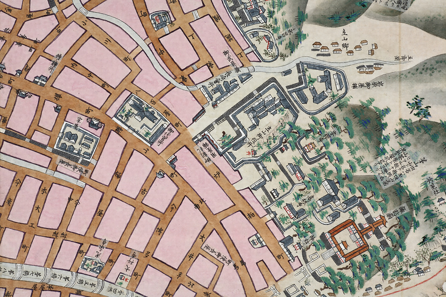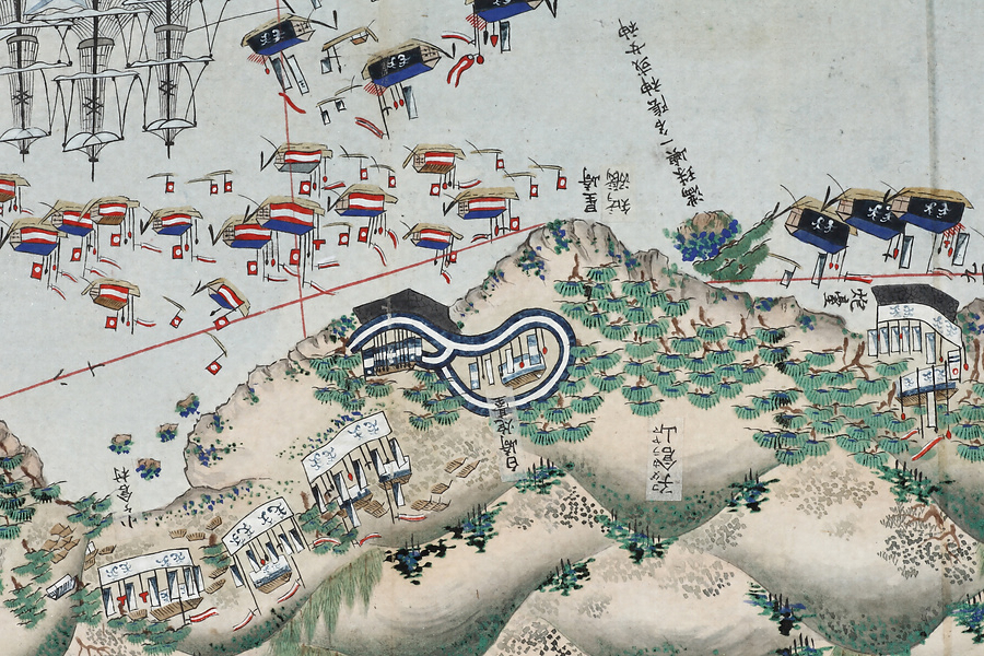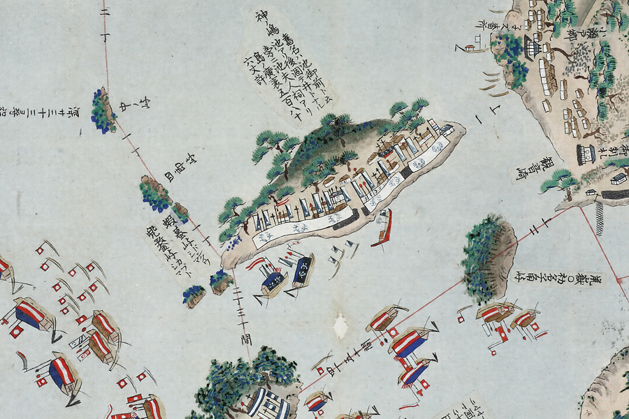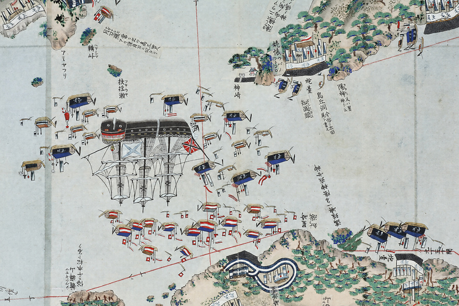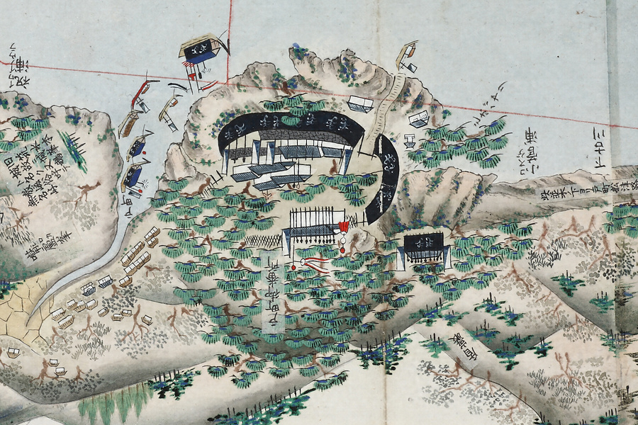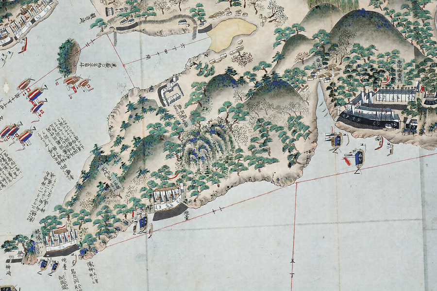 長崎湾沿岸部を中心とした絵図で、東は浦上村から西は遥か野母半島の先端まで描かれている。佐賀藩は福岡藩と隔年交代で長崎警備を担当していたが、戸町と西泊の両番所には佐賀藩の陣幕が張られており、本図は佐賀藩当番年の様子を描いている。長崎湾の内目と外目の境界にあたる神崎にはロシア船と見られる軍艦が停泊しており、その周りを佐賀藩船と福岡藩船が包囲している。このように本図の中核をなすのは長崎警備関係の情報とみられ、砲台や煙硝蔵、遠見番所を描くほか、岬間には無数の地点を朱線で結びその距離を記している。ところが、例えば佐賀藩が陣幕を張り警備にあたっている神ノ嶋には、「旧名ハ池御前ト云。池アリ後涸テ井トナル。旁ニ池夫人祠アリ」という貼紙があるなど、本図には地名のほか浦々・谷・峯・山、祠や寺社などについてその別称や由来などの地誌情報が詳細に記されている。またピンク色で表された長崎市中には役所や大名屋敷のほか町名・橋梁名を記すなど、単に警備のみならず長崎の歴史・地理を含む膨大な情報が精緻な絵画表現とともに盛り込まれているのである。