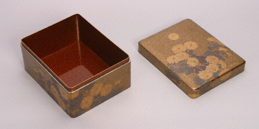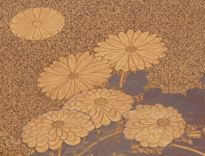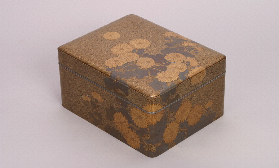 大正11年(1922)10月22日、朝香宮鳩彦王のフランス留学に際し、皇后陛下より御餞別として拝領したもの。総体梨子地とし、側面から正面にかけて、満開に咲く菊を描いている。菊の葉は銀蒔絵、花は金の薄肉高蒔絵とし、輪郭に沿って薄く青貝を嵌め、控えめながら輝きを与えている。