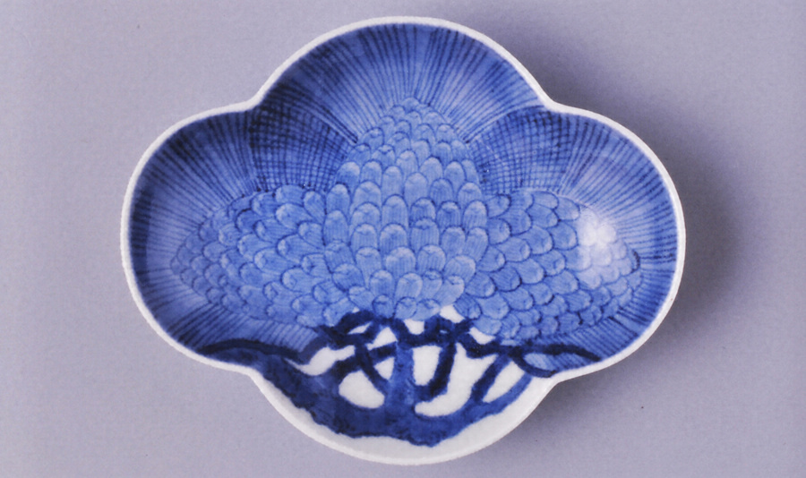 糸切細工成形により木瓜形につくった小皿。見込みの下部には枝を、上部には三つの松笠と松葉を左右対称に配している。鍋島焼の特徴である櫛目高台で、外側面には牡丹唐草模様をあらわす。