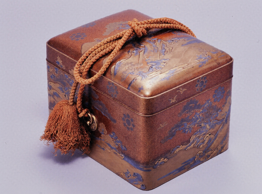 内部に懸子を納めた梨子地の手箱。全体に池と築山を巡らせ、築山の頂部には松と橘を描き、蓋表には雉と庭木、側面にはホトトギスや野草などをあらわす。文様の空間には九曜紋を散らしている。みかんの一種である橘は、理想郷である常世の国に生える不老不死の果物として尊ばれ、松と組み合わせて長寿をあらわす吉祥模様とされる。この手箱は所用者不明ながら、九曜紋を用いる大名家の婚礼調度と考えられる。
