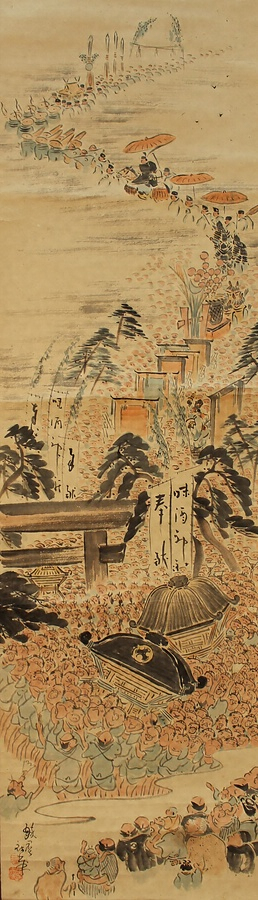 「松山祭り」は10月5〜7日に行われ、特に7日の神輿の鉢合わせで知られる。江戸時代、松山藩では味酒社・湯月八幡宮・正八幡宮の祭を三祭と呼んでいた。本資料は、江戸時代の味酒社祭礼の宮出し行列を描いた図である。手前の二体の神輿は、屋根と胴を締め、担ぎ棒に固定しており、鉢合わせ、舁き比べを描いた構図と見られる。神輿舁きは、浴衣姿にたすき掛け、頭には鉢巻を結んで、神輿を中心とした祭りの熱気が伝わる構図となっている。その先に宮出し行列として先頭には、鉾3本と大台鉾1基に続いて弓・立傘・神職・徒士、さらに作り物が3基、傘(台)鉾が描かれる。境内には、幟がはためき、「奉献・味酒神社」と染め抜かれ、右端には祝福芸の三番叟万歳も描かれる。作成年代は人物像や味酒神社の幟などより、江戸時代末期の祭礼風景を明治時代になって描いたものと考えられる。松山祭りを描いた絵画資料としては初出と思われ、断片的な文献資料を補足する存在として注目される。今日、神輿の鉢合わせが知られる松山祭りであるが、江戸から明治時代にかけて、多様な練り物を伴う城下町の祭礼行列であったことがうかがえる。しかし、近代における練り物の衰退により、現在の神輿に一元化され、松山の祭礼文化が作り上げられたと考えられる。松山市における祭礼の変遷を物語る上で重要な資料である。
