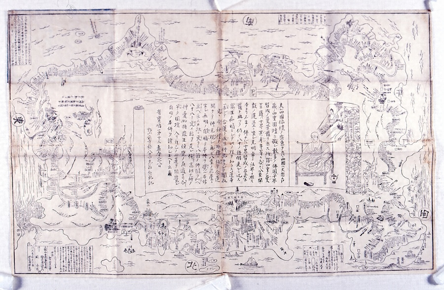 現存する四国遍路の絵図の中で刊行年が記されている最も古い絵図。宝暦13年(1763)成立。四国の形は南を上、北を下、東を左、西を右という配置で、本州の中国地方から四国を眺めたようにデフォルメされて上下逆に描かれている。四国八十八ケ所の札所と遍路道が描かれ、城下、番所、国境、山坂峠、村里、名所、番外札所、港の名前、札所間の里程などが克明に記され、江戸時代の現存する四国遍路絵図の中で最も詳細な内容となっている。作者は但馬(兵庫県豊岡市)出身の細田周英で、西国巡礼には絵図があるのに対して四国遍路にはそれがないことから本図を作成した。四国遍路の全体像をはじめて詳細に視覚化した意義はとても大きい。本図からは、江戸時代の中期には八十八ヶ所の札所や番外霊場、遍路道などが整備され、四国全体を巡礼する広域な霊場として四国遍路が行われていたことを見て取れる。江戸時代の四国遍路絵図は、本図の内容を超えるものはなく、本図を参考に改変を加えたものや模刻されたものが多く、四国遍路絵図の頂点として、以後の遍路絵図に大きな影響を与えた。