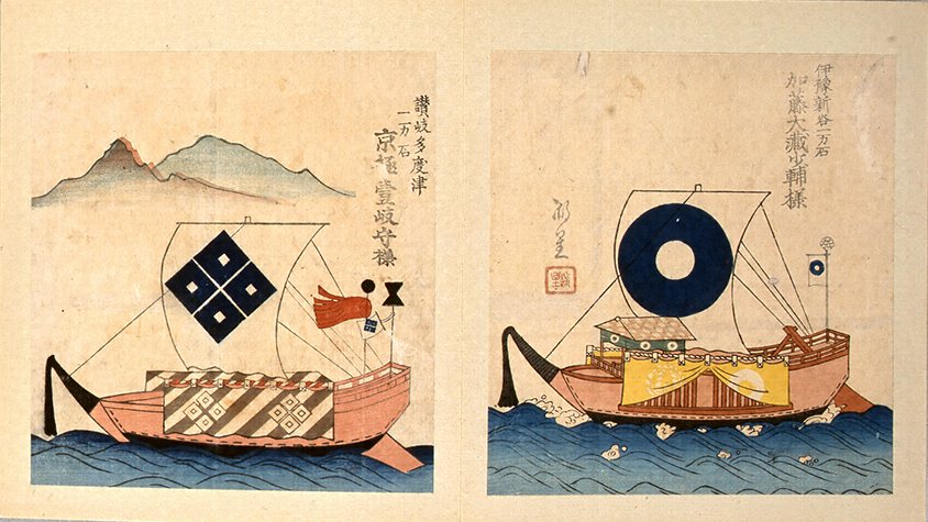 西国・四国・九州の諸大名の御座船を描いた摺物。木版色刷で、32枚が1帖に仕立てられている。大名ごとに帆印・船幕が描き分けられているが、船の形や背景の表現は形式化している。絵師の名前としては、湖里・蓼水・蛙夢が記されている。