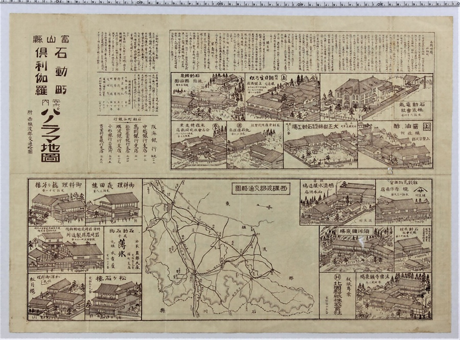 石動町(現小矢部市)と倶利伽羅峠周辺を示した広告つきの鳥瞰図。
