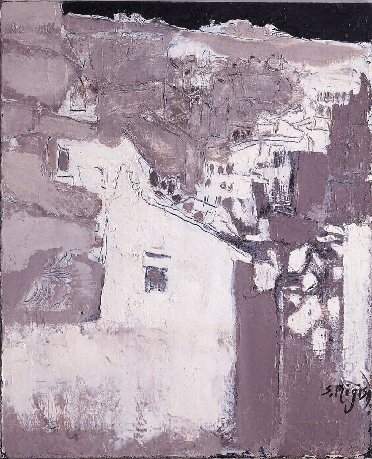 白壁の家が延々と続く眺めをモノトーンの世界に描き出している。空は真っ黒に塗りつぶされているが、かえってそれが無限の空間を感じさせる。下地に黒を、その上からグレーと白を塗り重ねており、家の輪郭線は引っかいた跡に現れる黒い線で表現されている。まるで壁塗りの作業をキャンバス上で再現するかのように絵具をナイフで塗り重ね、自由な動きの引っかき線でモチーフを縁取ることで、画面に軽やかさと繊細さをもたらしている。この引っかきの技法は夫の好太郎も用いており、塗り重ねの出来る油絵具の特質を生かした技法といえる。