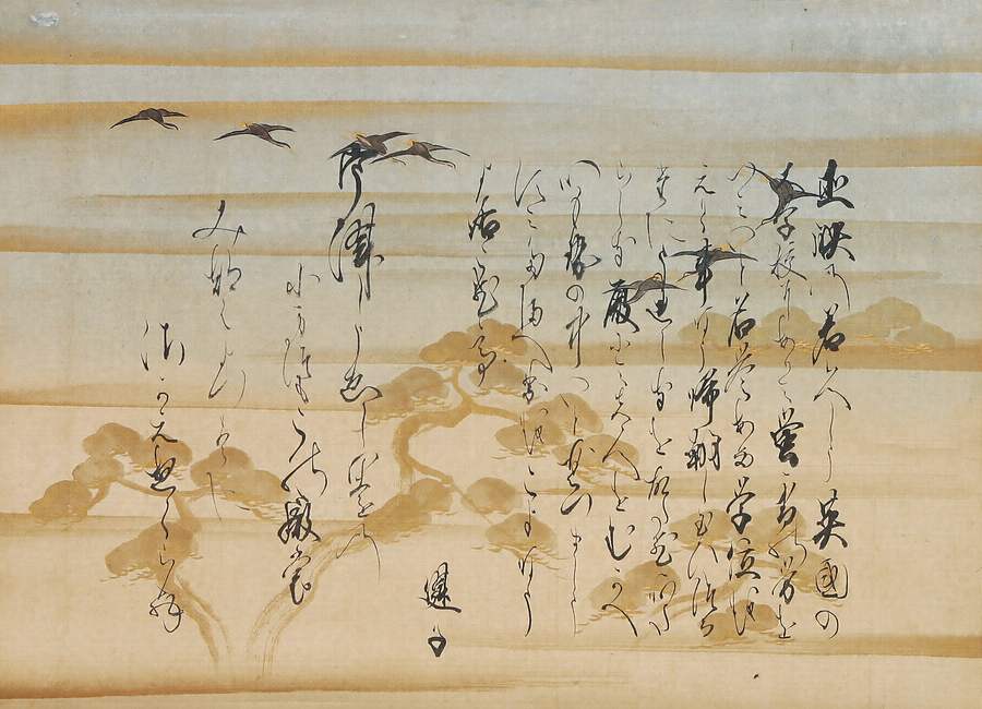 本作は直映の帰国と結婚を祝し、伯母にあたる松平慈貞院(貢姫・健子)が書き贈った和歌書。「移し植えし園の小松もこの殿も 三つ葉・四つ葉に栄え行くらむ」と詠み、直大(松印)の子直映の門出を祝った。泥引きの霞の間を七羽の鶴が舞い、松樹が寿ぎを添える。