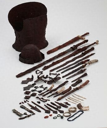 本件は、島内地下式横穴墓群から出土した古墳時代の出土品一括である。 金属製品は鉄製武器・武具が主体となり、馬具、工具、装身具がわずかに含まれる。特に短甲五点、胄三点、蛇行剣十点は、畿内以外の地域では傑出した出土量を誇り、銀象嵌龍文大刀は全国で三例目の出土である。いっぽう、鉄製農具と土器の副葬は皆無で、武器・武具に大きく偏った副葬品の構成を見せている。通常の古墳では遺存しにくい骨鏃、貝釧など骨角貝製品が良好に残存する。金属製品の遺存状態も極めて良好で、短甲の革製覆輪、鹿角製・木製刀剣装具が遺存する。