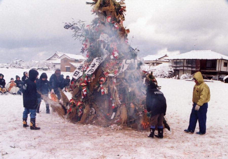 邑町のサイノカミは、厄払いや無病息災、五穀豊穣などを祈願する小正月の火祭りである。早朝より、子どもたちが、サイノカミの唄を歌いながら家々を訪問して正月飾りを集め、菓子などをもらう。このとき最年長の子どもがデクという男女一対の木製の人形をもつ。子どもたちが各家を回る間、地区の境では竹と藁で円錐形の作り物が作られる。子どもたちが回り終えると、デクを正月飾りとともに作り物の中に納めて火をつける。デクが完全に灰になるまで燃やして行事は終了する。(※解説は指定当時のものをもとにしています)