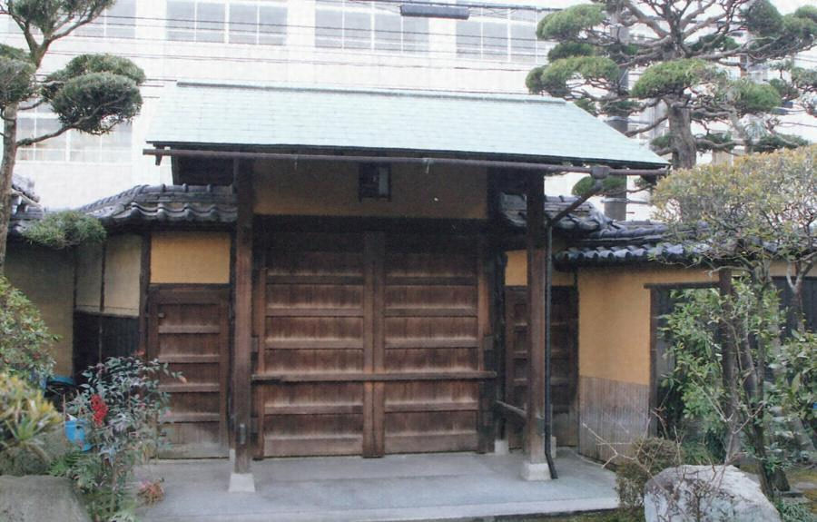 敷地南辺の中央に、道路から少し引いて建つ。1間薬医門で、切妻造銅板葺。節くれ立った檜丸太を本柱とし、母屋まで延ばし、母屋と楣間に土壁を塗り、正面側には欄間を飾る。一軒疎垂木の化粧屋根裏天井で、御影石の4半敷。数寄屋風意匠の穏やかな表門。