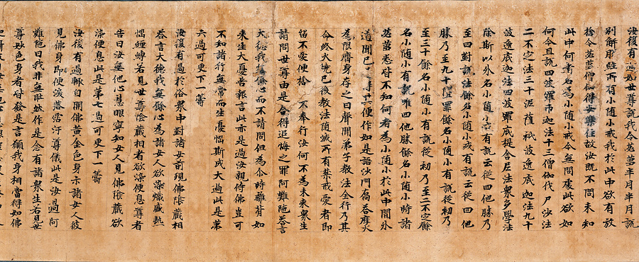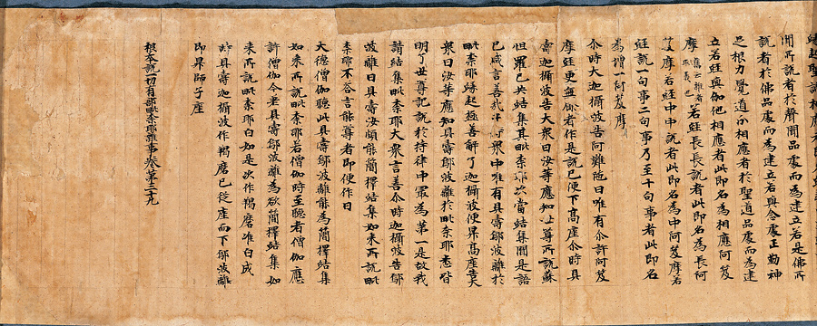 唐義浄訳の有部所伝の『根本説一切有部毗奈耶雑事』四十巻の残巻で、本文首部を欠くが、香木を細かく砕いて漉き込んだちう荼毘紙九枚を継ぎ、赤密陀原軸が存する。同時代の写経中聖武天皇宸翰を伝称される字粒の大きい『賢愚経』を「大聖武」、類似の写経で小さいものを「小聖武」と称するが、本経は世に「中聖武」と呼ばれ、ともに古筆家の珍重するところで、多くの断簡が古筆手鑑などに貼られている。本巻のように巻子の体裁をのこしているものは珍しく、貴重である。