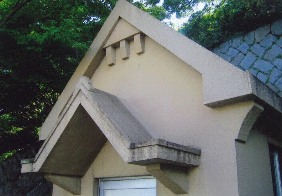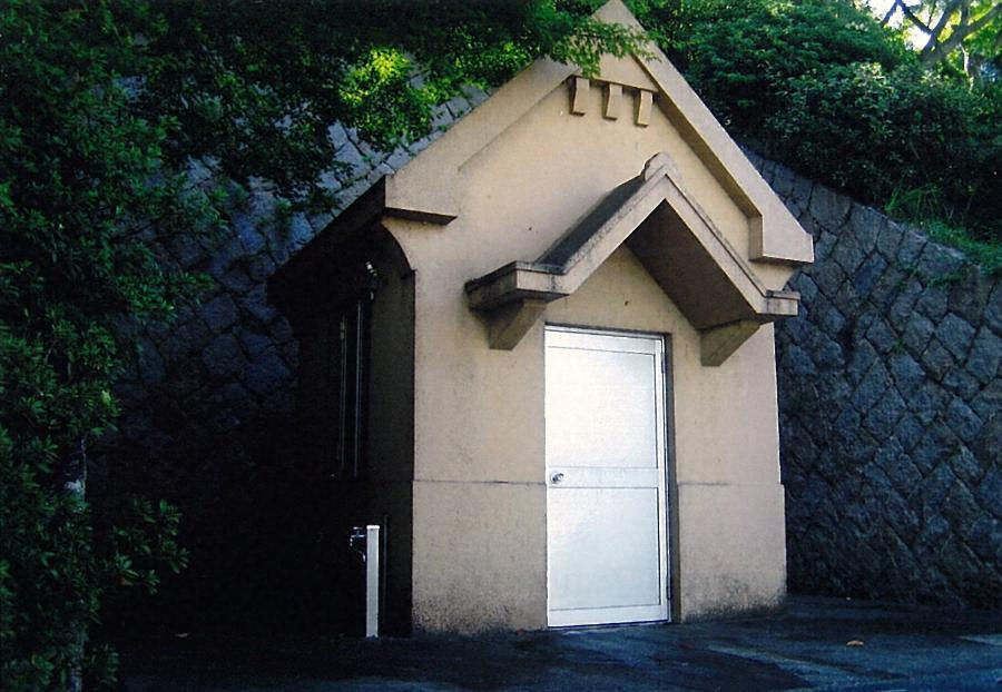 尾道市街の丘陵上にある浄水場南端に建つ。桁行二・六メートル梁間二・六メートル、鉄筋コンクリート造、切妻造妻入で、正面出入口に切妻屋根の庇を付ける。軒下や妻面に繰型風の持送りを付けるなど、木造洋風建築を鉄筋コンクリート造で表現した上屋である。