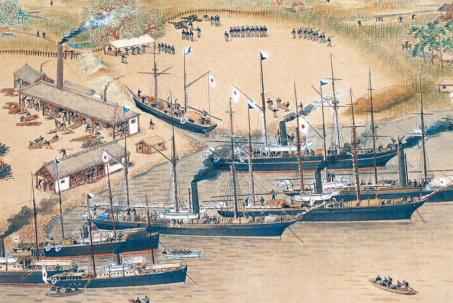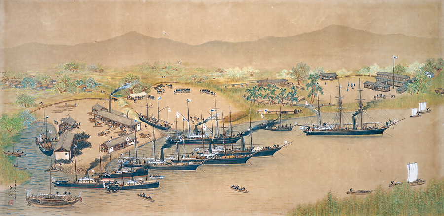 安政5年(1858)正月23日三重津(現・佐賀市川副町)に御船手稽古所が設けられた。翌年幕府の長崎海軍伝習が中止されたが、佐賀藩は練習艦観光丸を預かり佐野常民を監督として三重津で伝習が続けられた。のちに海軍で佐賀藩出身者が活躍することになる。慶応元年に佐賀藩が製造した蒸気船凌風丸を始め、藩が購入した軍艦が勢揃いし、左に造船所、中央では訓練の様子、右には学寮など、慶応期の様子が描かれている。明治2年5月鍋島直正は海軍創設を建議した。