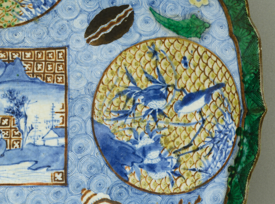 有田の初期色絵の手本となった中国磁器(色絵祥瑞)と、それを忠実に写した初期色絵が対で伝来した唯一の例。中央と上下左右の窓絵には山水や花鳥が描かれ、周辺には巻貝や子安貝、珊瑚や七宝文、犀角文といった吉祥文様をあらわし、外側面には松竹梅と竹鳥を組み合わせた文様を描く。有田の色絵創始期に、中国磁器を手本に技術開発していく姿を示す好資料といえる。安政2年(1855)作成の「御寄附物帳」に、「青絵御鉢 内壱ツ裏銘大明嘉靖年製 二」とあるのが本作で、2枚1対で伝来した。初代鍋島勝茂から菩提寺である高伝寺に寄附され、大正14年に鍋島家に返納された。