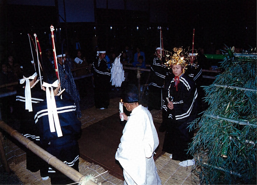 「厳島」「大仏供養」「石橋山(いしばしやま)」の三番が伝承されている。若者達は本殿下の舞台に立ち並び、台詞の順番と役名が告げられると名乗りを上げ、続けて会話体につづられた長い物語の詞章を謡うように語る。物語の登場人物を一人一役で語る。語りの最後には「フショ舞」が舞われる。演者の一人が扇をかかげ、足踏み強く舞う。