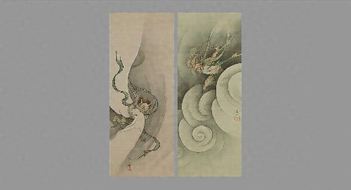 風神雷神図といえば俵屋宗達の国宝の屏風(京都・健仁寺蔵)が有名ですが、橋本雅邦による本作品は、宗達のそれとは二神の配置が逆で、その姿態も異なっています。右の雷神は渦巻型に意匠化された雷雲に乗り太鼓のばちをふりあげて、恐ろしい形相で下界を見下ろしています。一方、左の風神は、やや神妙な面持ちで口許を結び、抱え持った風袋から勢いよく風を吹き下ろしています。野派の描法だけでなく同時代の新しい表現を貪欲に自身の創作のエネルギーへと変えた雅邦らしく、本作も画家の独創的な創意工夫が垣間見られる画面に仕上がっています。