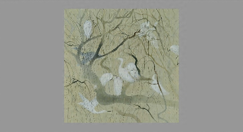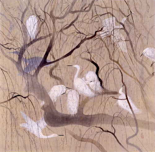 柳に鷺の組み合わせは、古くから繰り返し描かれてきた伝統的な画題です。降りしきる雨の中、幹に白鷺が集い、あるいは周囲を飛び交っています。奇妙に曲がりくねった幹が画面を特徴づけ、不可思議な雰囲気をたたえていて、作者が実験的な表現に果敢にチャレンジしている様子が見てとれます。昭和10年代に描かれた大作のほとんどが戦火で焼失していますが、師の児玉希望が主宰する画塾展への出品作である本作品は幸い現存。戦後風景画家として大成する前の花鳥画の作例としても大変貴重です。