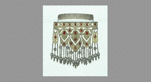 この作品はふたつの部分に分かれており、鉤のついた弦で前板を首に下げます。鉤は頭に飾り羽のある鳥の姿となっています。カーネリアン、鍍金による文様そして透かし彫り、びっしりと下げられた魚型の飾りによって華やかな印象を与えます。トルクメン・ジュエリー後期の名品といえるでしょう。