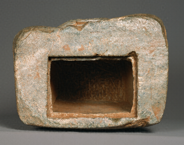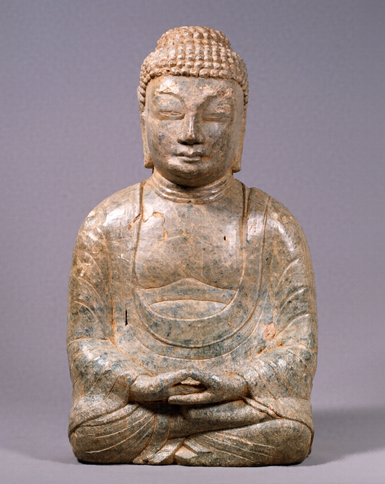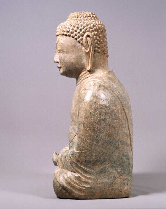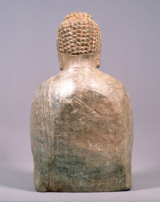 玄界灘に浮ぶ壱岐島の鉢形嶺経塚から出土した、滑石製の丸彫如来形坐像で、像底に長方形の内刳を施して、経巻を納めるように工夫し、像自体を経容器とした類例のない遺品である。右肩から背面腰部にかけて、延久3年(1071)に始まる願文が刻まれ、弥勒如来の出世にそなえて法華経を仏像の胎内に奉籠した旨が記されている。石像は頭部に螺髪(らほつ)を刻出し、衣を通肩にまとい法界定印を結び、別製の滑石製の蓮台の上に右足を上に結跏趺坐する。石材の制約上、膝張や膝の出の少ない地方作品ではあるが、全体の肉付は、平安後期前半にふさわしい量感をそなえている。蓮台の蓮肉部上面には九品往生印(くぼんおうじょういん)が刻まれ、その中には結縁者の名前が記され、弥勒信仰の複合のさまがうかがわれ、注目される。