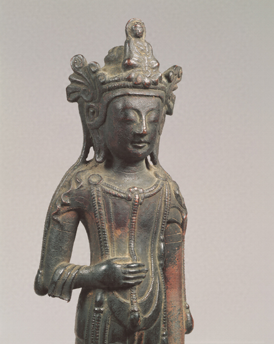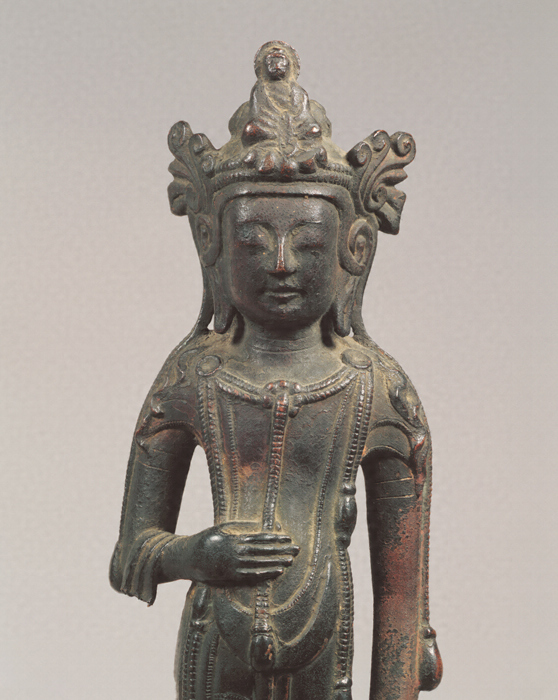 大きな坐化仏(ざけぶつ)を頭飾の正面につけ、おだやかな微笑を浮かべた観音菩薩像で、すらりと伸びた肢体が独特の魅力を放つ。臘型(ろうがた)の一鋳で制作されており、蓮肉部まで中空で、体部はムクとしている。右手を腹にあてて瓔珞(ようらく)をはさむが、同様の手の表現は法隆寺献納宝物182号(東京国立博物館)、東京・海蔵寺、高知・金剛頂寺などの観音菩薩像にもみられる(このうち金剛頂寺像は瓔珞に手を添えない)。これら諸作例は様式的にも本像に近く、特定の由緒ある像の姿を範として、複数の像が制作されていた可能性を示す。