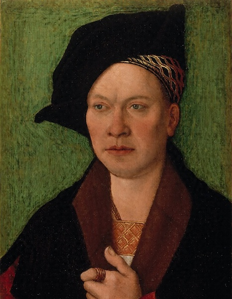 緑を背景に黒のベレット帽を斜めにかぶった若い男性は、左手でマントの胸元をかたく握りしめている。ほとんど正面を向いた顔は写実的かつ立体的に描かれ、その巧みな細密描写によって、この紳士の精悍な性格までもが浮き彫りにされている。全体にゴシック的な生硬さを残すものの、ドイツ・ルネサンスの新たな芳香を感じさせる優れた肖像画の小品となっている。