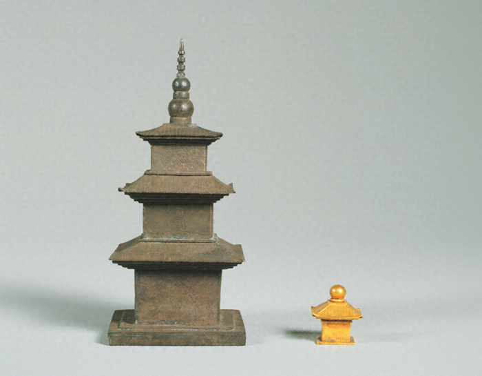 銀を鍛造(たんぞう)し、鑞付けで形作った三重塔形舎利容器(さんじゅうのとうがたしゃりようき)。各層と三層目屋根の四部分に分解することができる。屋根には瓦列(かわられつ)を線刻し、軒下は四段の階段状としている。相輪(そうりん)は下半部に大小二個の玉を連ね、上に四輪を表している。塔身は各層とも一面にのみ、それぞれ異なった尊像(初層は天部立像、二層目は如来坐像、三層目は千手観音坐像)を線刻している。金製舎利容器は銀製容器内に安置され、直接舎利を奉安していたと推測される。金鍛造製で宝形造(ほうぎょうづくり)の堂宇をかたどり、屋根が容器の蓋となっている。層塔形舎利容器は朝鮮半島の統一新羅時代から高麗時代にかけしばしば見られ、層塔の軒下を階段状とする例も同時代に多数見ることができる。また、相輪に複数の大きめの玉を連ねた形式が高麗時代の塔に見られることから、本品の製作時期は高麗時代と推定される。