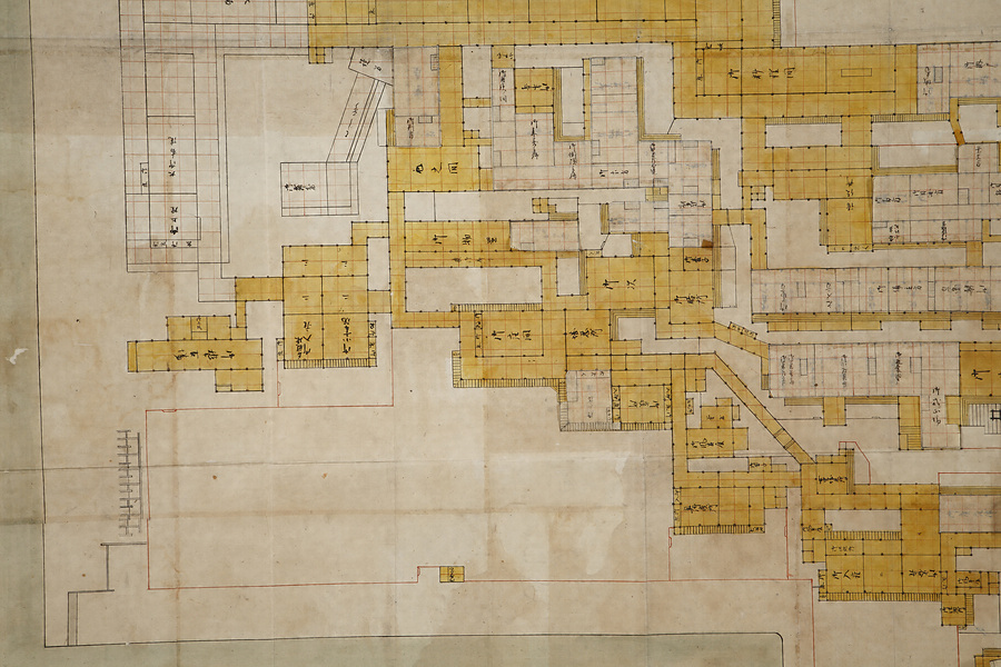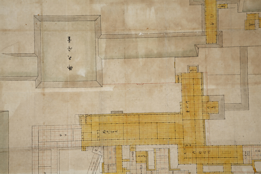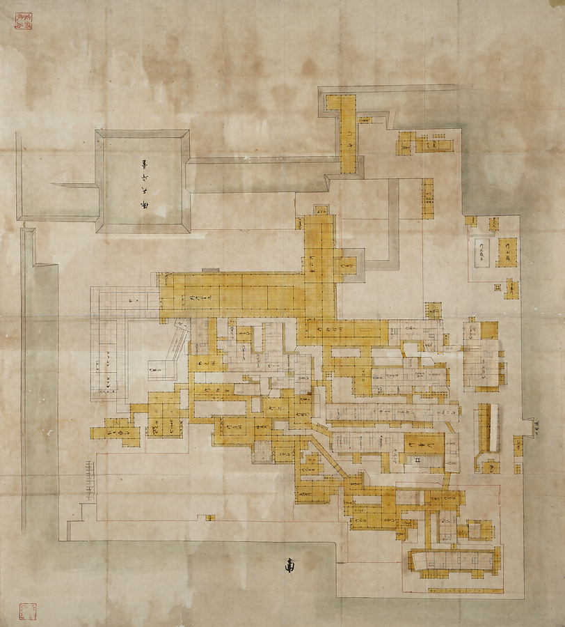 佐賀城は享保11年(1726)の火災により天守閣をはじめ本丸・二之丸・三之丸などの建物が全焼し、その後は二之丸御殿が藩庁としての機能を担ったが、再び天保6年(1835)の火災により焼失した。そこで10代鍋島直正は本丸御殿の再建にとりかかり、同8年に完成し、翌年直正が入り以後はここで政務を執った。本図はこの時の本丸御殿再建プランを示したものである。御玄関・御式台・外御書院・御料理間などの表、藩主の居室である御座間などの中奥、長局などの大奥、さらには請役所や御懸硯方などの役所機能も取り込んだ藩政拠点としての役割が認められる。これらの建物群の遺構は県立佐賀城本丸歴史館設置に伴う発掘調査でも確認されたが、本図中の大溜・大御書院・能舞台などの遺構は確認されず、計画のみで建てられなかったことが分かった。