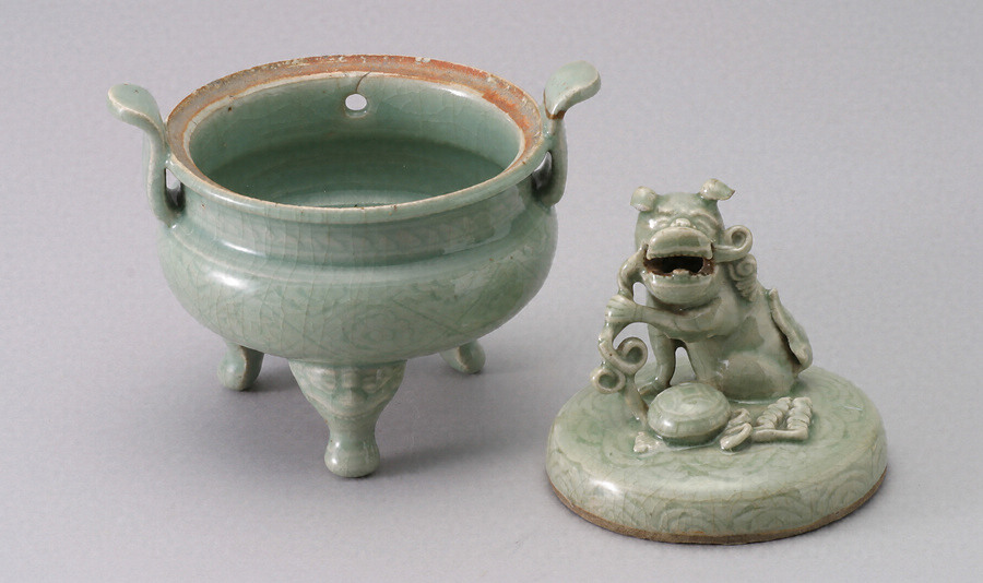 青磁獅子紐三足香炉
