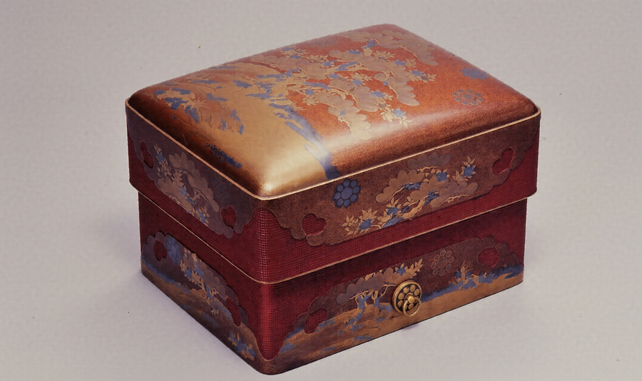 角赤手箱とは、身と蓋の口縁より四角にかけて隅金物にかたどり、荒い布目を出して朱漆塗りにし、他の部分を黒漆塗あるいは梨子地にし蒔絵をほどこしたもの。方形、角丸の被蓋造で、甲盛があり、塵居をつくる。内に納めるものに決まりはなく、化粧道具や身の回り品などを入れる。通常は、大と小の一対とする。この手箱は総体梨子地とし、池と築山から生える松と橘の樹を表し、模様の間に銀平文による九曜紋を散らす。所用者は不明ながら、九曜紋を用いる大名家の婚礼調度と考えられる。