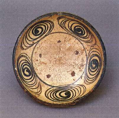 江戸時代後期に瀬戸・美濃地方で製作された盛りつけ用の皿。渦巻き文を周りに配置する特徴から馬目皿と呼ばれた。中野区内旧家の伝世品。