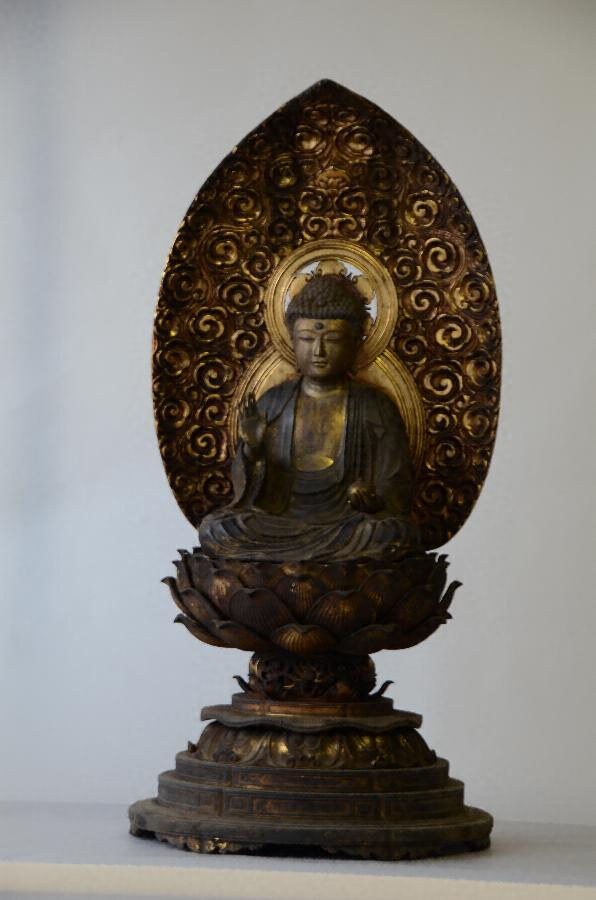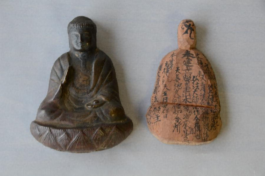 平成21年11月、本尊である木像の修理を行った際に銅像と木製中型が胎内より発見された。