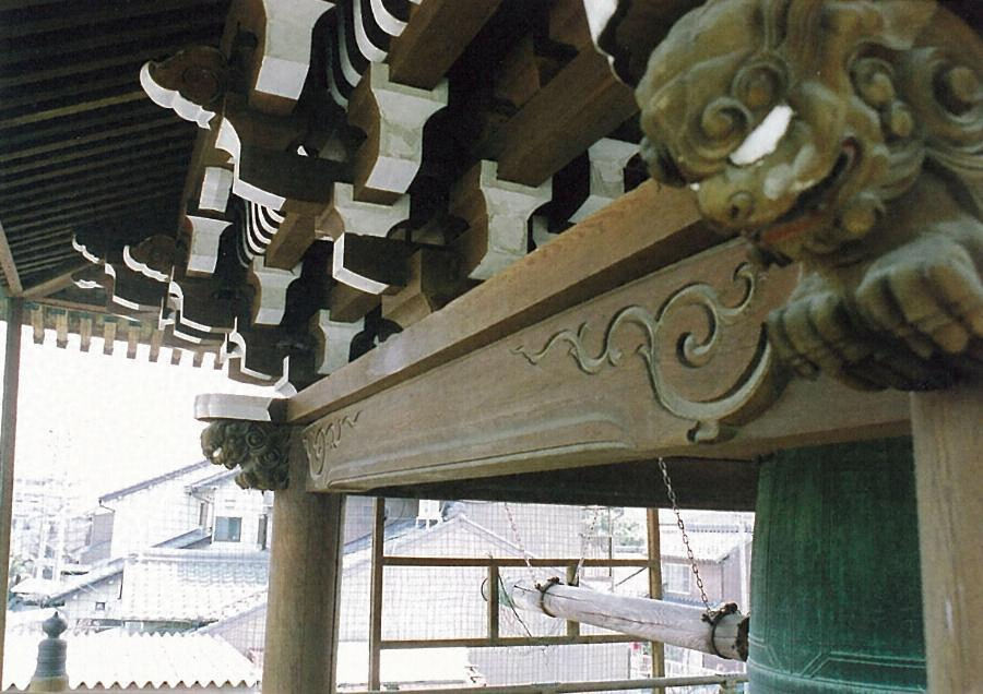境内の南東側に建つ鐘楼で、方一間、袴腰付、入母屋造桟瓦葺である。亀甲石積の基壇上に建ち、腰組は二手先で擬宝珠高欄付縁を支持し、上層も二手先組物で小組格天井を張り、軒は二軒繁垂木である。丁寧なつくりの鐘楼で、境内景観を引き立てている。