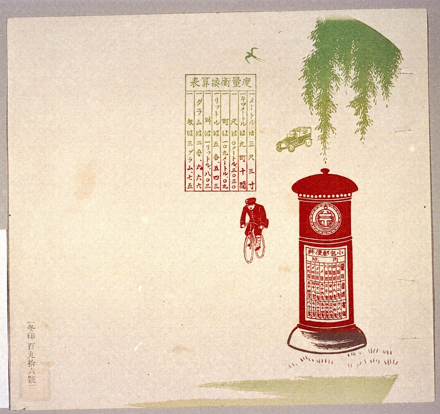 うちわ絵図案(回転式ポスト[明治41年並形柱箱]と自転車の郵便外務員)