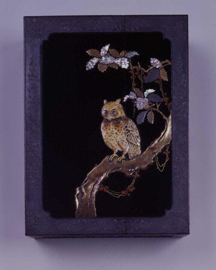 方形被蓋造、台脚付の料紙箱。蓋表は、四方入隅の窓を設け、中央を黒漆地とし、蔦の絡まる柏樹とその幹にとまる一羽の木菟を配する。文様は、金高蒔絵、鉛板、螺鈿を使い分け、木菟は陶板を象嵌する。周縁に設けた窓枠には、鉄粉蒔絵で七宝唐草文を巡らす。蓋葛の四面の窓には、それぞれ黒漆地に鉄粉蒔絵で四季の漢詩を配する。