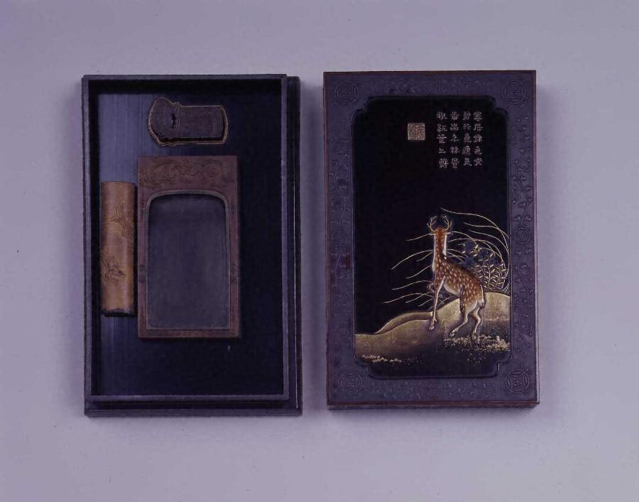 方形被蓋造、台脚付の硯箱。蓋表は、四方入隅の窓を設け、中央は黒漆地とし、漢詩、に秋野に佇む鹿、秋草、七宝唐草文などを配する。文様は、鉄粉蒔絵、陶板による象嵌、金高蒔絵などで表す。蓋葛には、四面それぞれに鉄粉蒔絵で「福」と「寿」の二文字を交互に表す。