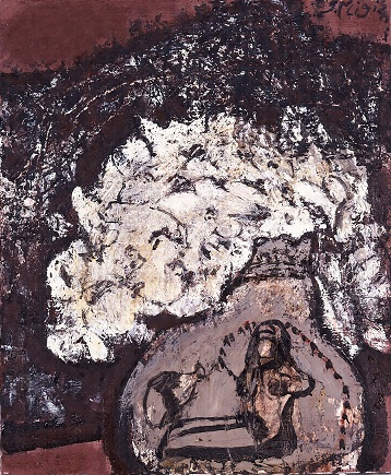 壺からあふれんばかりに咲き誇る花々が描かれている。壺に描かれた女性像は、画面全体を引き締めるとともにロマンチックな雰囲気を作り出している。まるで白くやわらかな花の束が、壺の女性を優しく包んでいるようである。花は作者にとって生涯にわたって描き続けた特別なモチーフであった。当初、静物画の中の一部であった花はやがて画面いっぱいに広がり、茎や葉を省いた独特の姿になっていった。ガラスの花瓶や古代風の素焼きの壺などお気に入りの花器に、自らの手で丹精こめて育てた花を飾ることは、作者にとって日常の大きな楽しみでもあった。花の絵を描くときには、自ら植えた花の苗が育ち、美しい花を咲かせるその生命力を思い描いていたことであろう。「壺あって花あり。花あって壺なお生彩。楽しみ多き人生なり。」(「花より花らしく」『花より花らしく』)花は作者にとって人生の喜びそのものであり、美の象徴でもあった。
