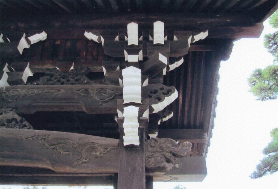 境内南入口に構える薬医門である。梁で持出した虹梁上の出組組物でさらに丸桁を持出し、軒を深める。虹梁上には彫刻化した蟇股をおき、背面では二重虹梁の各段に同様の蟇股を千鳥に配する。また妻飾大瓶束の笈型なども立体的な彫刻を多用する装飾性豊かな門。