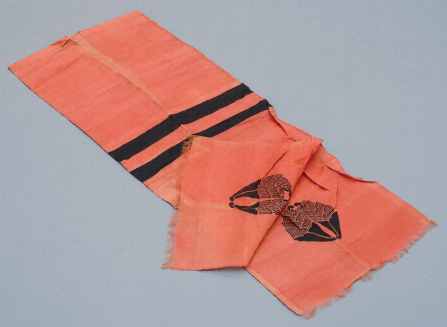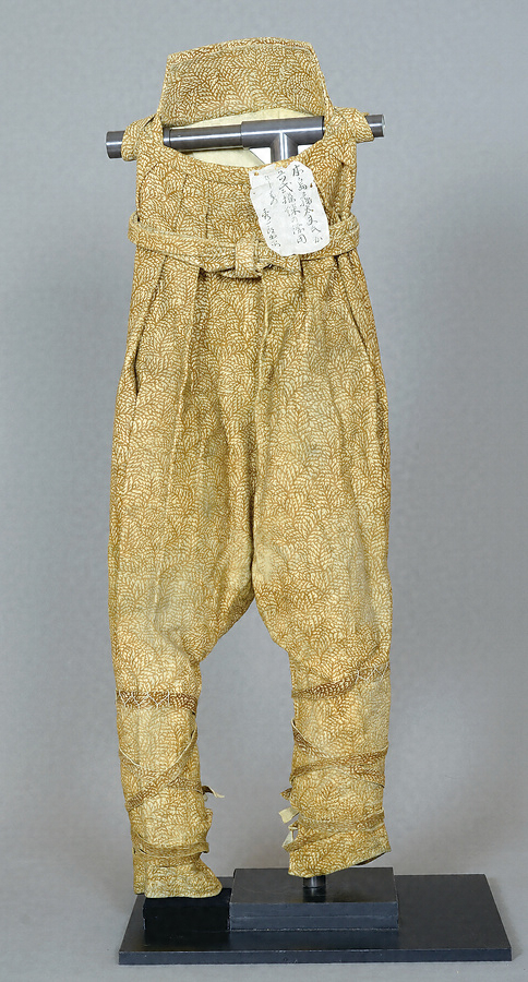 陣羽織、鹿革製裁着袴、袖、鹿革製手袋、甲当、杏葉紋旗など、佐賀藩士本島藤太夫の所用品として伝わる資料群。本島は、江戸時代末期の佐賀藩で鋳立方の責任者をつとめた人物。赤く染められた吹き流し状の旗には鍋島家の家紋である杏葉紋が黒く染め抜かれる。袴には「兵式操練に用いた」と貼紙があり、西洋式軍事調練に用いられたものか。侍は銃陣稽古でこうした裁着袴を用いることとされていた。