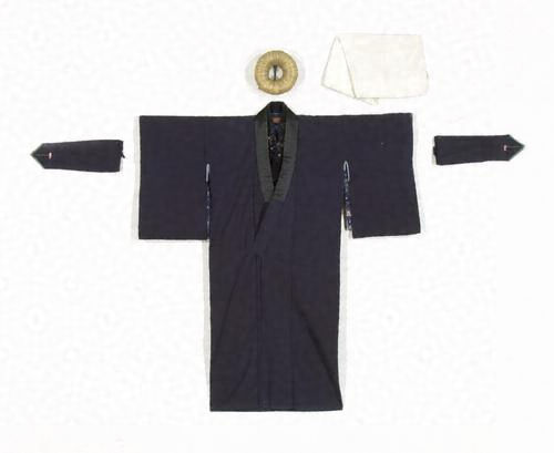 着物1枚 藍木綿 丈 132.0 裄 60.0 胴着1枚 襟-別珍 袖-型染 胴-藍木綿 丈 71.0 裄 69.0 前垂 藍木綿 刺繍 帯-型染 76.0×93.0 襷紐 縮緬友禅 帯 型染 340.0×33.0 甲掛1組 藍木綿 脚絆 白木綿 1組 輪台 藁 1 草鞋 1足 手拭 藍染 白布