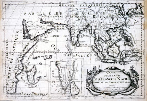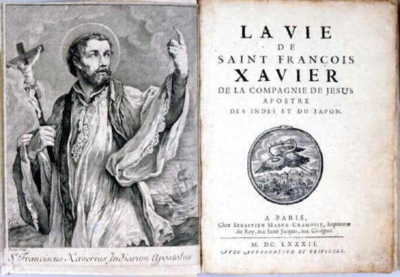 イエズス会のドミニク・ブウール(1628‐1702)が1682年に出版したザビエルの伝記。ザビエルの少年時代に始まり、イエズス会の創立、インド布教、マラッカにおける日本人との出会い、日本での布教、中国への旅の途中での死去、また彼の起した奇蹟などについて記述されている。扉絵にはザビエルの聖人としての肖像画があり、また彼の布教の道程を示した地図もおさめられている。なお、同書は、19世紀までに数十回も版を重ねて出版されており、英語、イタリア語、ポーランド語、アラビア語などにも翻訳されるなど、人気を博したようで、本書はその初版本にあたるもの。