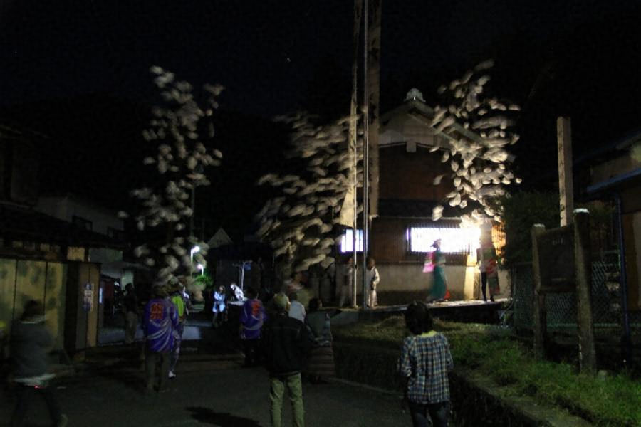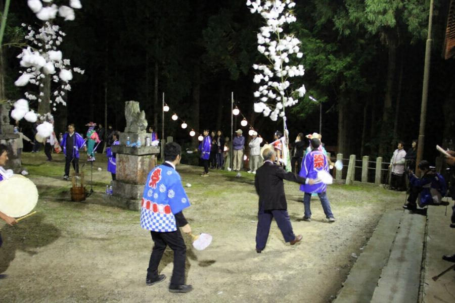 祭礼の夜、祭り宿に神幸していた神が神社へ還幸する行列に伴って、祭り宿を「(道中拍子)」で出発し、新区長宅で「庄屋」、神主宅で「お伊勢」、薬師堂で「見物」・「かね汲み」を踊り、宮境(神社の参道口)で「カミナリ」、鳥居で「ケット」を打ち、神社の階段で通称「(ゾコゾ)」を打ち、八幡神社の拝殿前で「カミナリ」・「シジュウ」・「宮立ち」・「世の中」・「綾の踊り」(出雲の綾)・「街道くだり」を奉納し、最後に「シジュウ」を打って締める。以上のように踊る場所を変えながら次々と踊られ、いわゆる「掛け踊り」の形式をもっている。 この太鼓踊りの囃子のうち「(道中拍子)」・「カミナリ」・「ケット」・「(ゾコゾ)」・「シジュウ」は囃子のみで歌を伴わない。現行の歌は上記の8曲だが、明治半ばから大正頃の歌を記したとされる「澤崎本」には23曲が収められている。芸能の主たる担い手は、音頭取り2~3人、鉦打ち1人、太鼓打ち5人、警護(女装に花笠の若者で団扇を持って踊る)6人である。神社境内での踊りでは、この輪の中に一般の住民の中から熟練者が加わって大きな輪踊りを形成する。