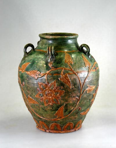 花や葉・蔓などの文様を貼り付け、緑・黄・紫の釉薬で彩られた五耳壷。明時代後期の中国華南地方で焼かれ、16世紀末頃日本国内に招来されたものといわれる。中世大友氏府内町跡をはじめ、大坂道修遺跡・奈良興福寺一乗院跡・東京汐留遺跡などから、同様の壷の破片が出土しており、特に府内町跡の事例ではその量の多さが指摘されている。本品は国内に伝世したもので、形式的には古いタイプの三彩貼花唐草文五耳壷とみられる。