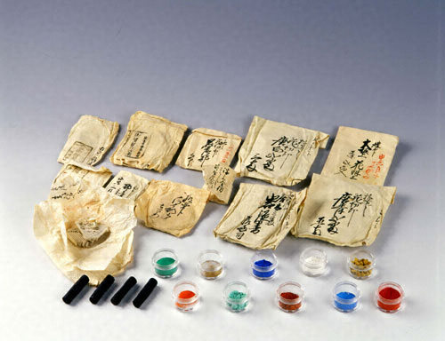 これらの絵具には、その包み紙から江戸の深川や京橋の絵具屋で入手したことが判るもの、長崎出島を通じての西洋の絵具(プルシアンブルーやウルトラマリンブルーなど)なども含まれている。