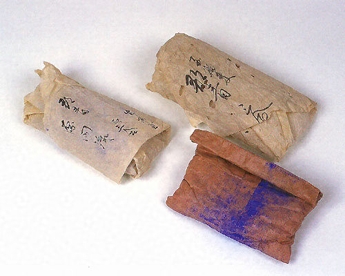 本資料は、江戸時代の顔料資料の残存という希少性や包み紙の文字情報等、当時の流通や絵画史を究明する上で貴重である。