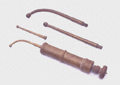 『武雄鍋島家資料目録』では「真鍮ポンプ」と記されているが、実際は「浣腸器」で馬用の浣腸器かと思われる。ポンプ部分に「K.kitsib」の銘があり、長崎の細工師金子吉兵衛の製作と考えられる。