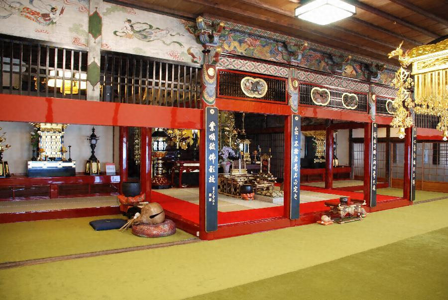 間取りは、正側三面に広縁を廻らし、堂前半を外陣、後半中央を内陣とし、内陣の両脇に脇の間と位牌の間を配する浄土宗特有の本堂形式をとる。