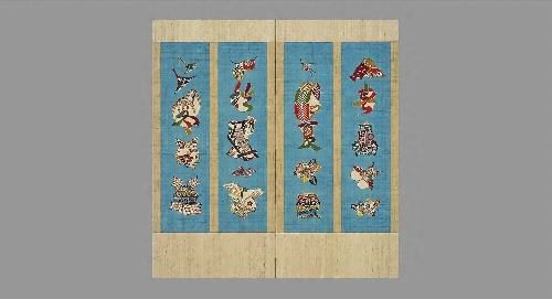 本作は,四つの画面に春夏秋冬の文字と,それぞれの季節を表す花鳥や風物を型絵染で描いています。型染は,模様を切り抜いた型紙を通して布に糊を置き,染色して糊の部分を染め残す技法で,同じ模様を多数染める方法として用いられてきました。作者は型染のこうした合理性や社会性を活用するだけでなく,唯一つの作品にも型紙を用い,型紙ならではの簡潔な図柄と鮮明な色彩対比を活かし,日本的情趣を生き生きと表現しました。