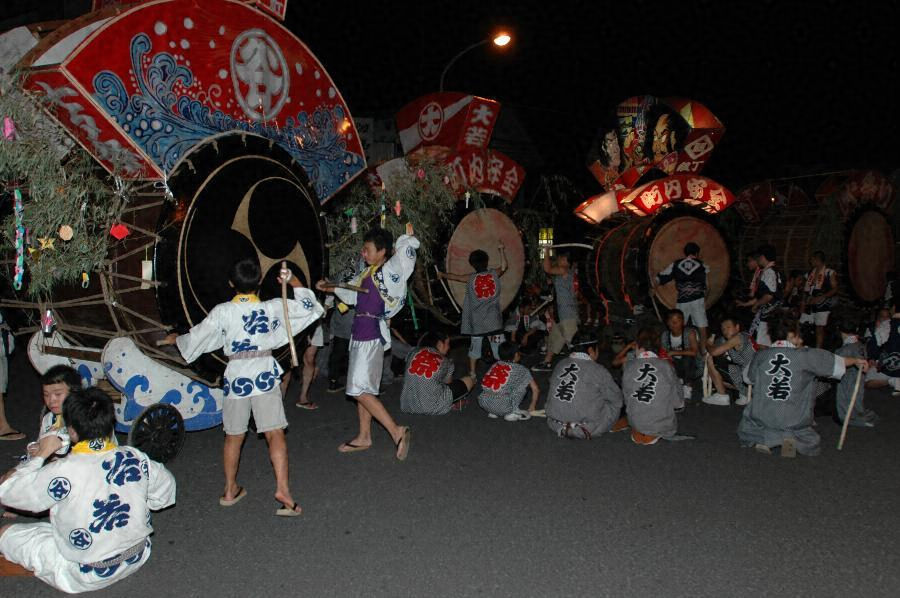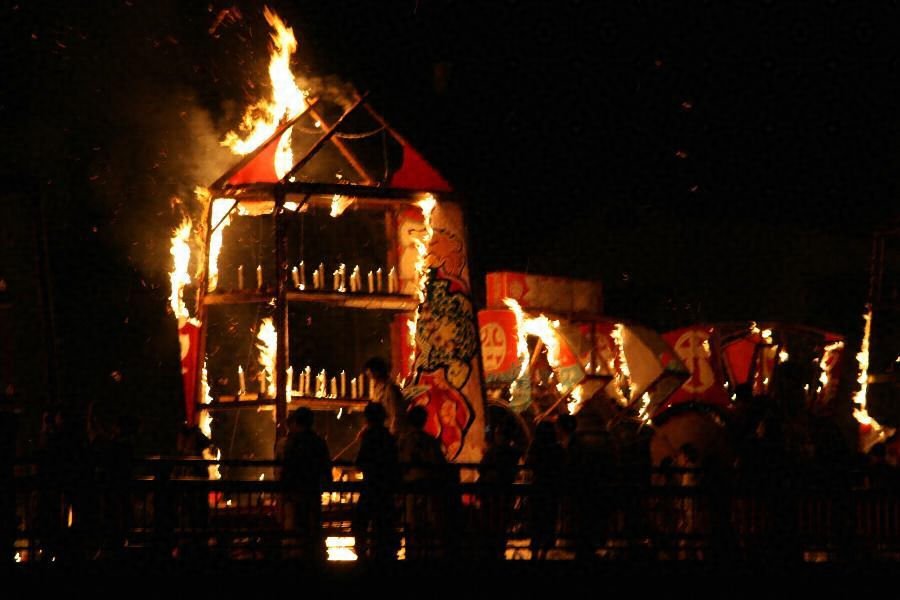 10町内から10台の大灯籠(将棋の駒の形をしたもの。表に王将、裏に武者絵が描かれる)と10台の大太鼓が繰り出し運行される。二日目の夜は米代川に架かる稲村橋に集合し、大灯籠や大太鼓の飾りに一斉に火が放たれ眠り流しが行われる。伝承曲として「七夕」と「大の坂」が伝わり、運行時は七夕が打ち鳴らされ、稲村橋で大灯籠に火が放たれた瞬間から曲は大の坂に代わり、忌み穢れを払う行事から、先祖霊を迎える行事へと切り替わる。