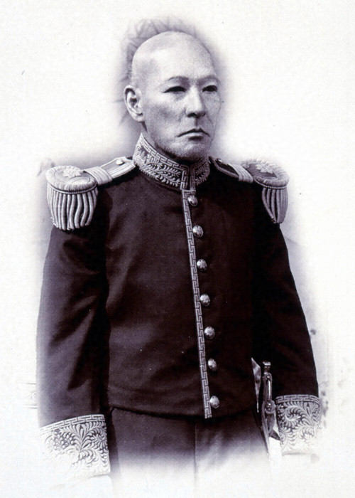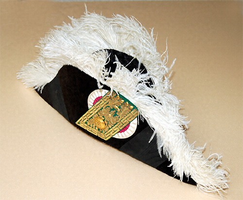 武雄領最後の領主、鍋島茂昌着用の有爵者大礼服。衿章・袖章・帽子右側章の地色の萌黄色は、男爵位を示す。